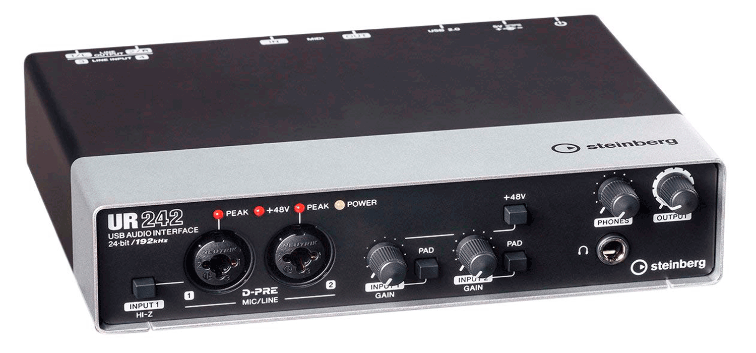 Steinberg UR242 es una Interface de audio USB 4×2 con 2x D-PRE y soporte 192 kHz. Con una calidad de audio y fabricación fuera de serie para su categoría de precio, la UR242 combina componentes seleccionados con avanzados efectos integrados basados en DSP que cubren gran variedad de situaciones de producción móviles.